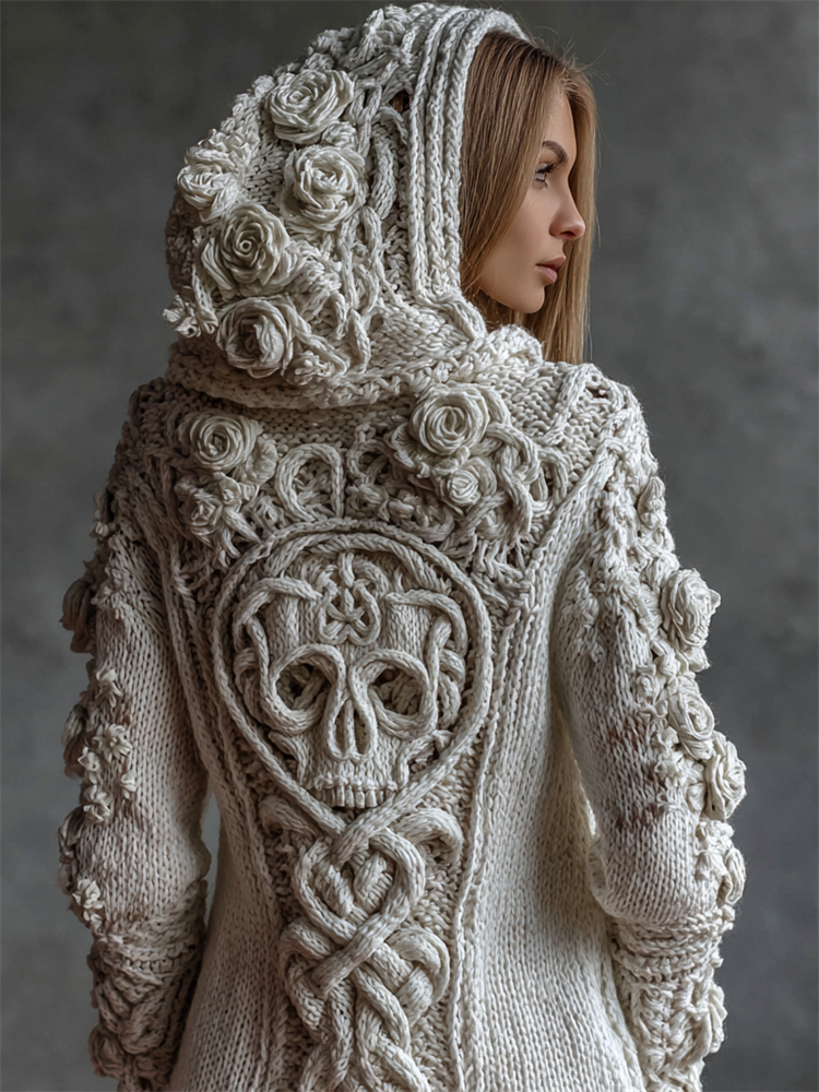 Women's Rose And Skull Inspired Chunky Knit Hooded Sweater