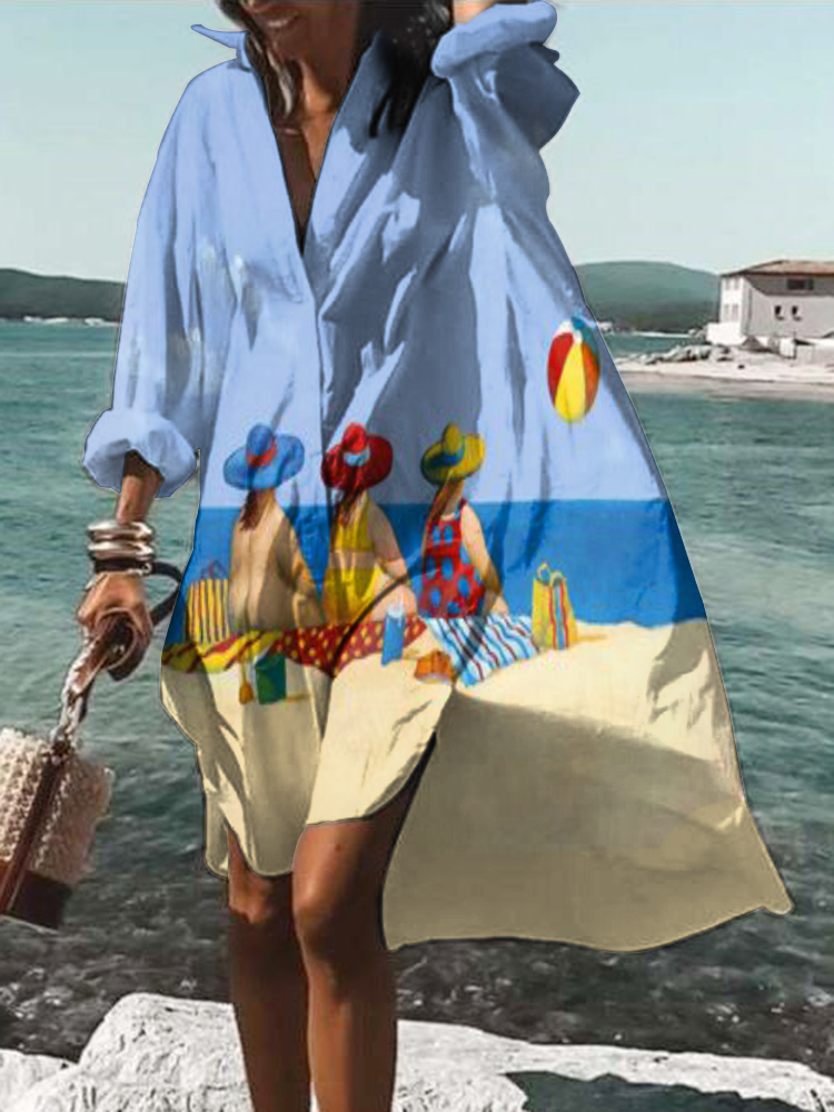 Women's Casual seaside ocean art character print loose shirt Dress