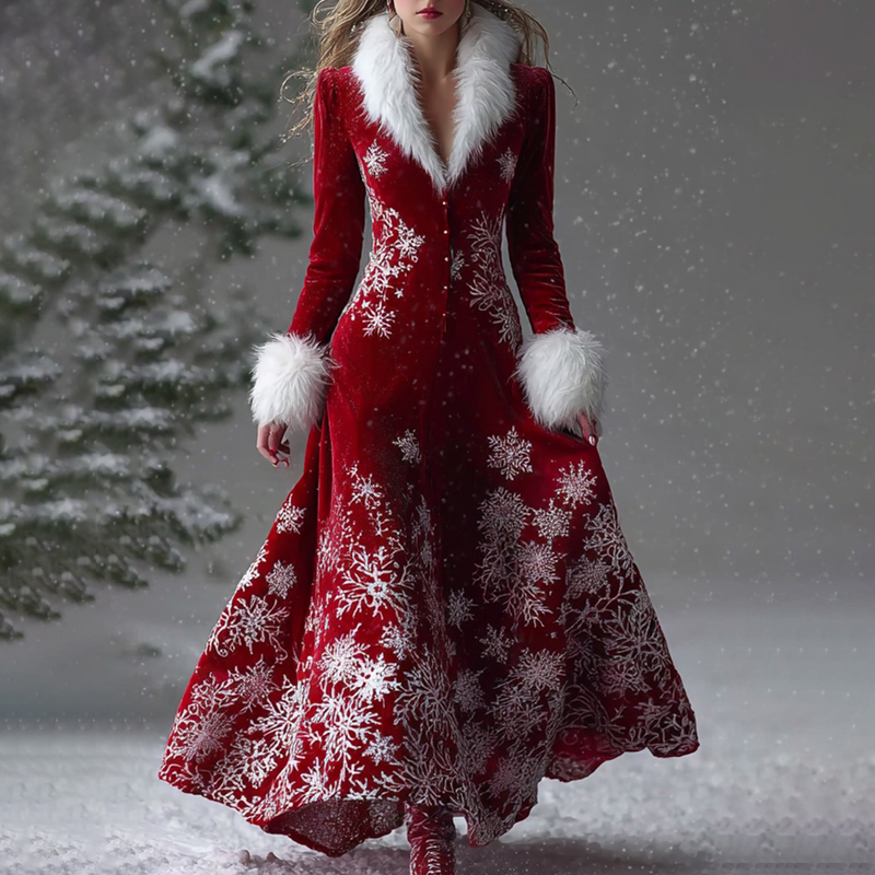 Christmas Snowflake Embroidered Fur Collar Velvet Maxi Dress