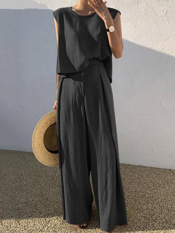 Cotton and Linen Fashion Casual Loose Two-piece Sleeveless Blouse Loose Wide Leg Pants