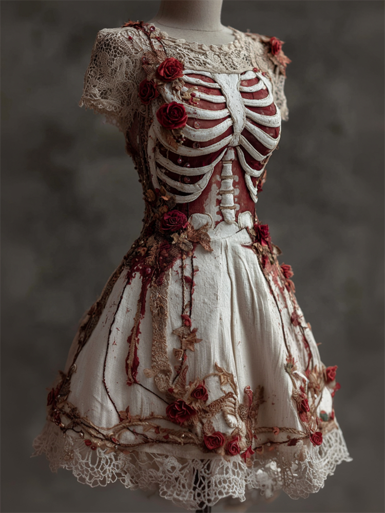 Halloween Bloody Red Roses Rib Cage Vintage Lace Linen Dress