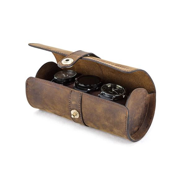 MEN'S RETRO COWHIDE CYLINDRICAL PORTABLE WATCH STORAGE BOX is a stylish and functional accessory designed to store and protect watches. Made from cowhide leather, this cylindrical case offers durability and a classic vintage appeal.