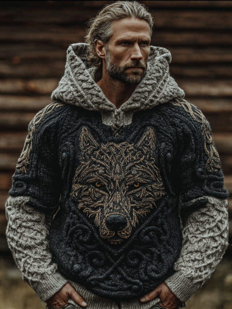 Men's Viking Style Wolf Totem Patchwork Hooded Sweater
