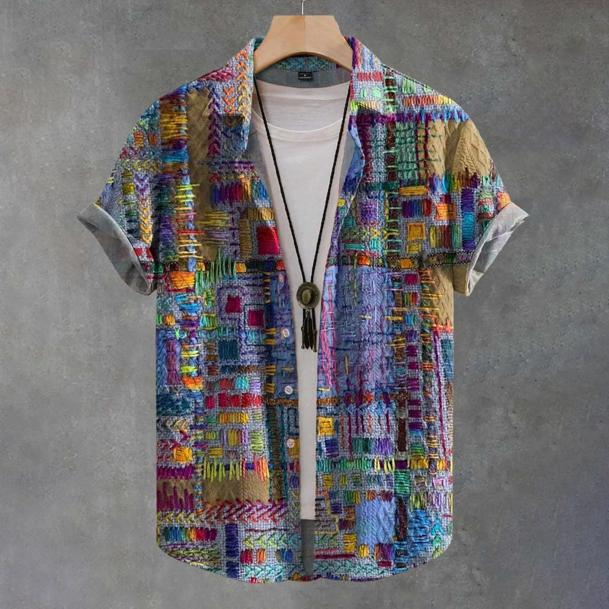 Men's Vintage Purple Patchwork Ethnic Art Print 100% Cotton Short Sleeve Shirt