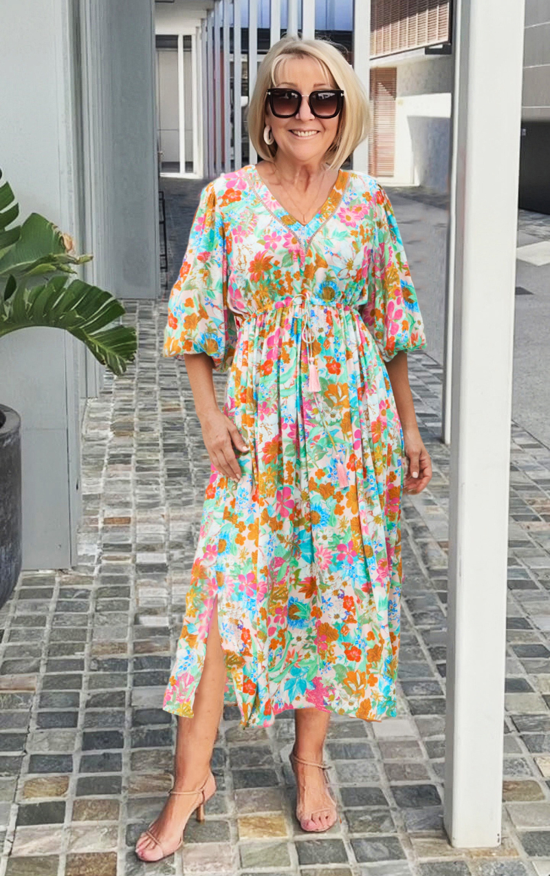 V-neck Printed Lantern Sleeve Tunic Dress