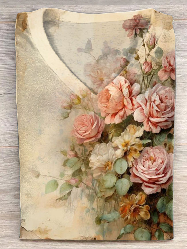 Retro Chic Old Floral Print V-Neck Short Sleeve T-Shirt
