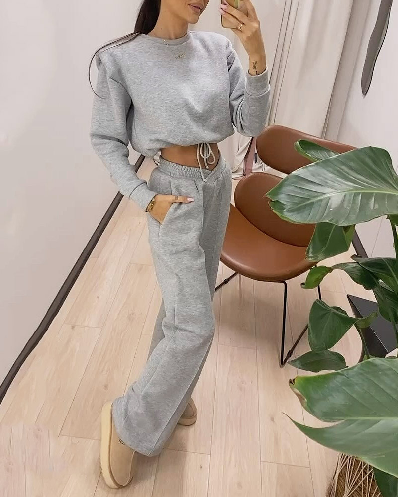 Solid Color Drawstring Short Sweatshirt & High-waisted Wide-leg Pants Two-piece Set