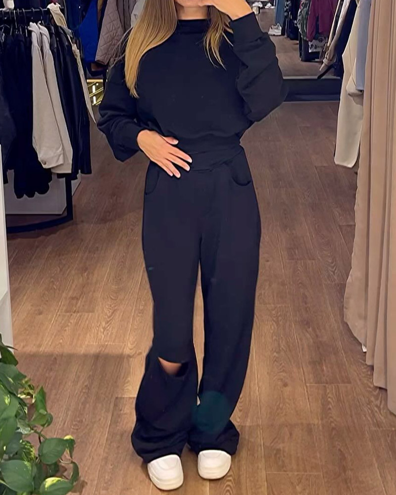 Solid Color Top & Casual Wide-leg Pants Two-piece Set