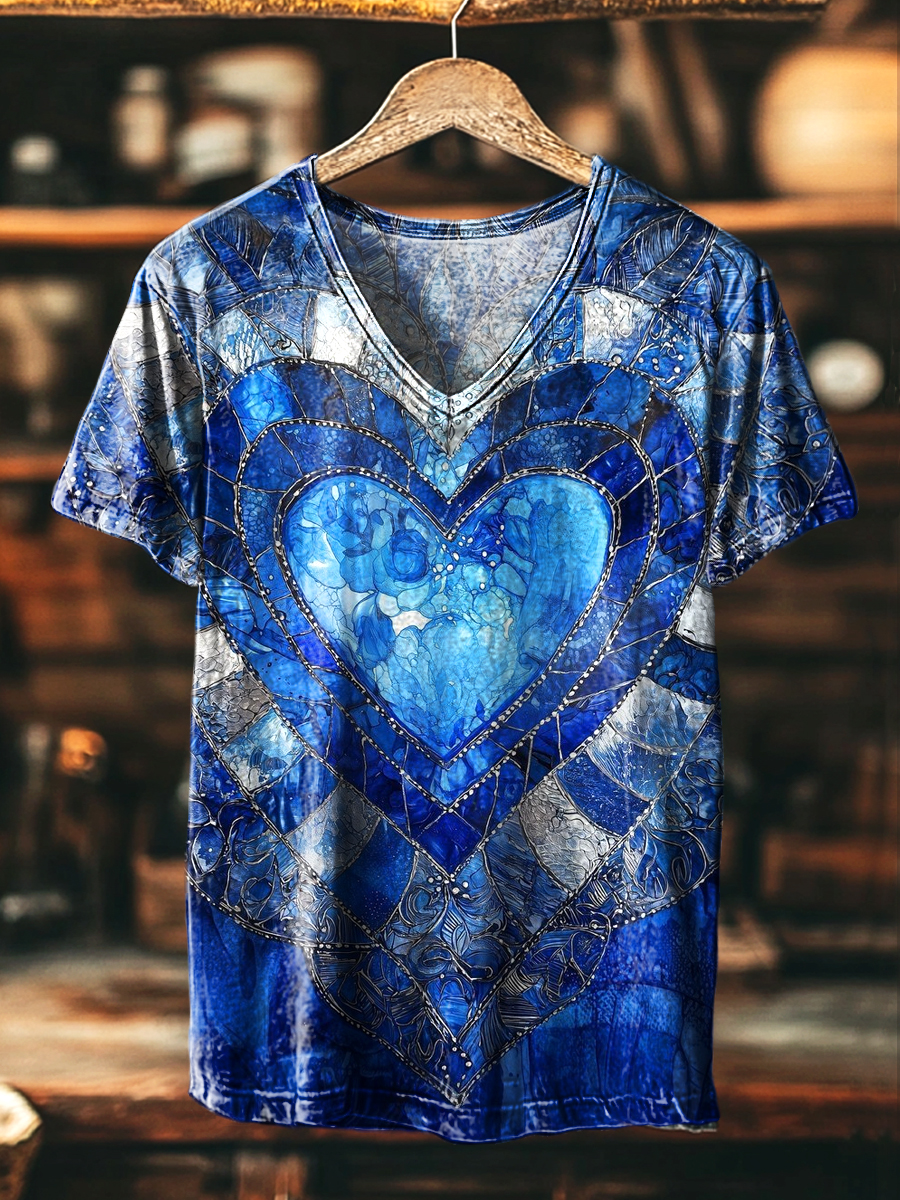Vintage Black Abstract Geometric Heart Print Casual V-Neck T-Shirt