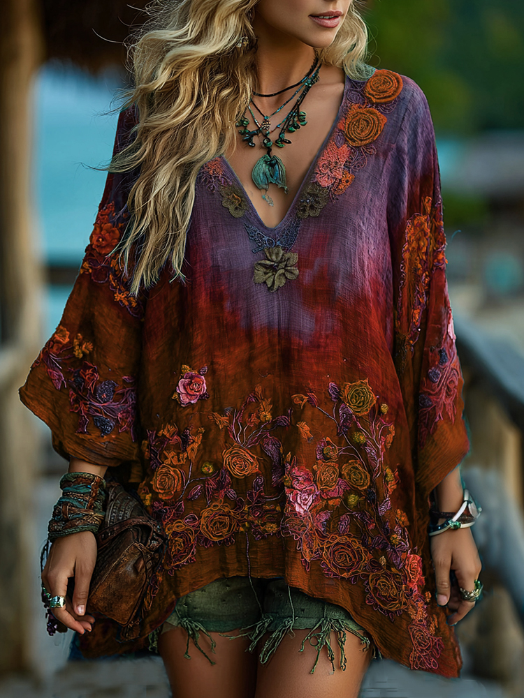 Vintage Classy Gradient Blue Rose And Floral Embroidered Pattern V Neck Long Sleeve Shirt