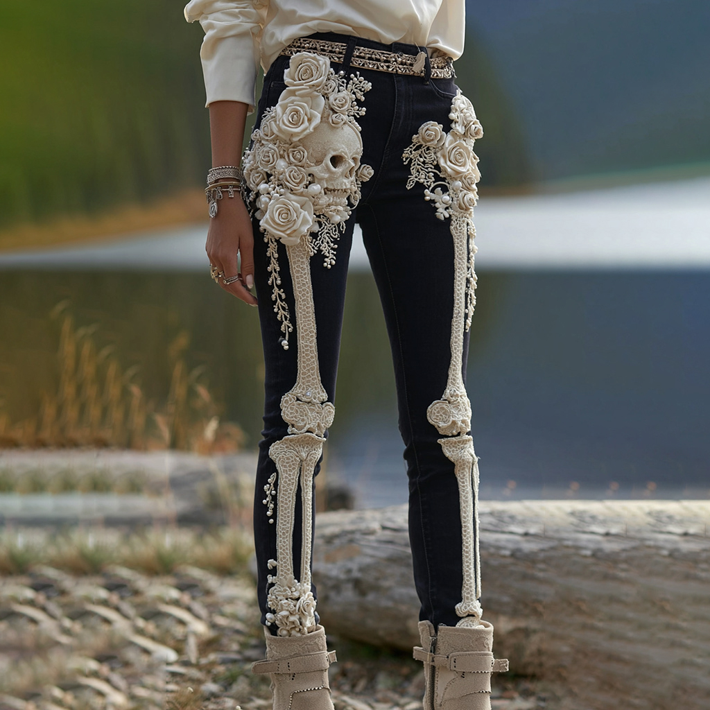 Vintage Halloween Skeleton Bones With Rose And Skull Art Jeans