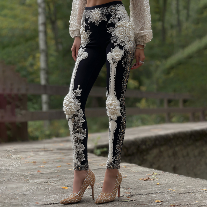 Vintage Halloween Skeleton Bones With Rose Art Leggings