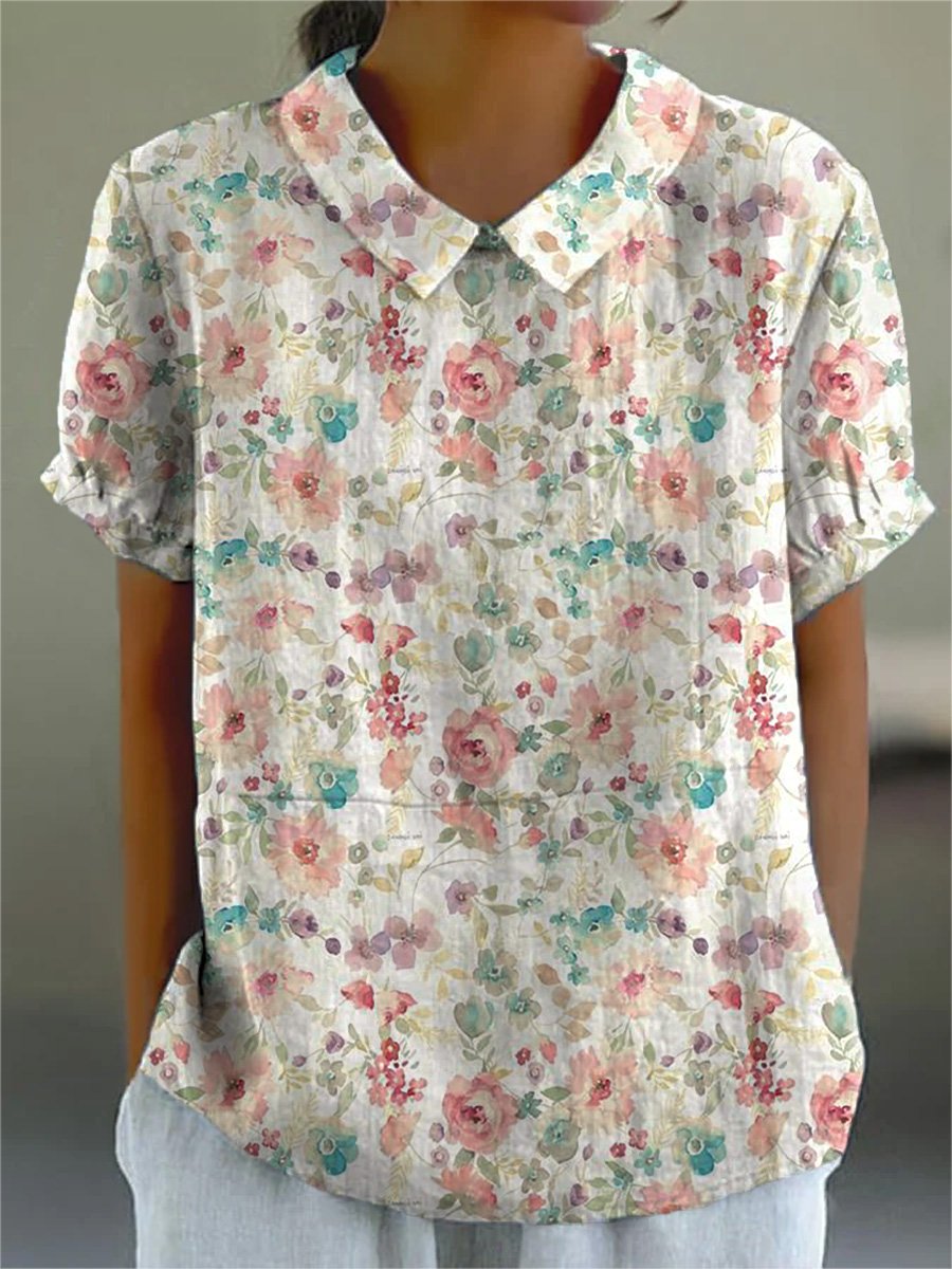 Watercolor Rose Garden Seamless Repeat Pattern Printed Women's Casual Cotton And Linen Shirt