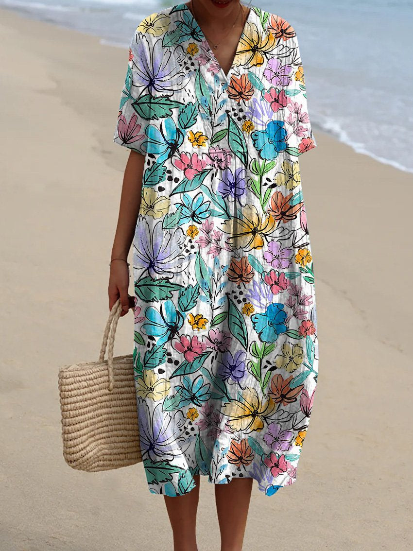 Watercolor Vibrant Floral Field Pattern Printed Women's Flowy Dress