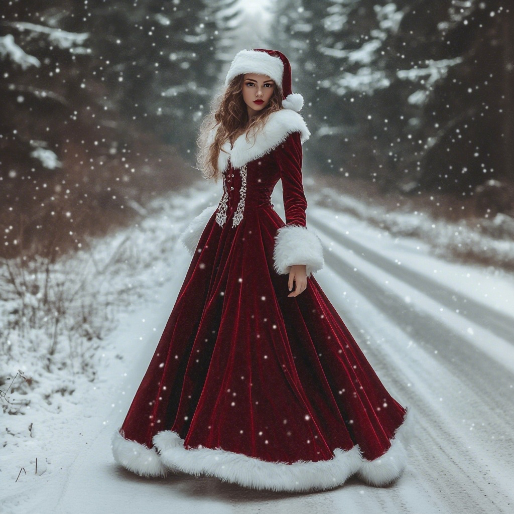 Women's Christmas Snowflake Fur Collar Velvet Maxi Dress
