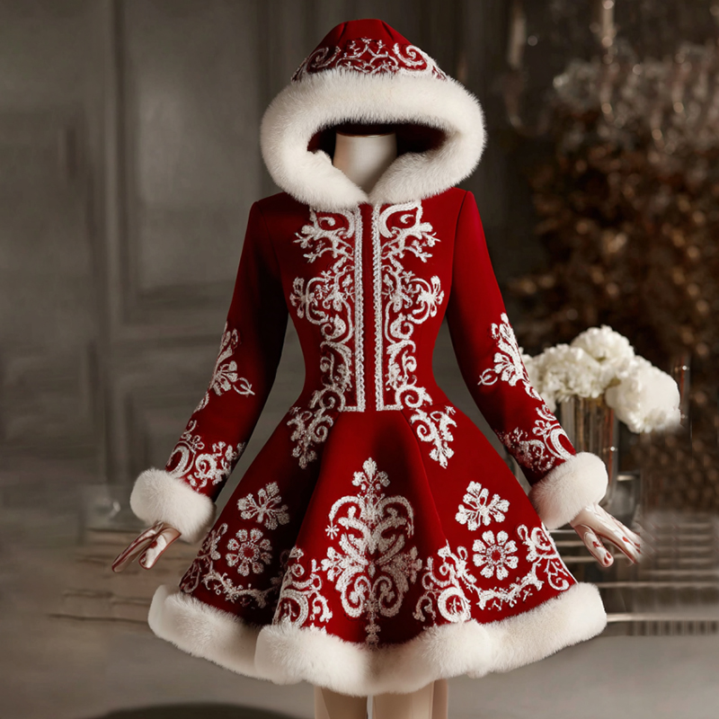 Women's Christmas Snowflakes Art Fur Trim Hooded Midi Dress