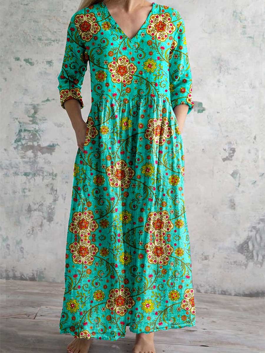 Women's Elegant Paisley Floral Pattern Cotton and Linen Dress with Pockets
