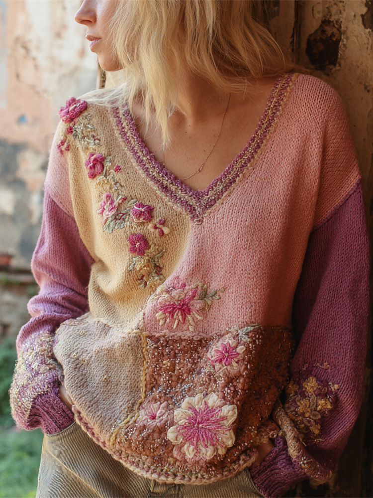 Women's Loose Lazy-Style V-Neck Pullover Sweater-1017