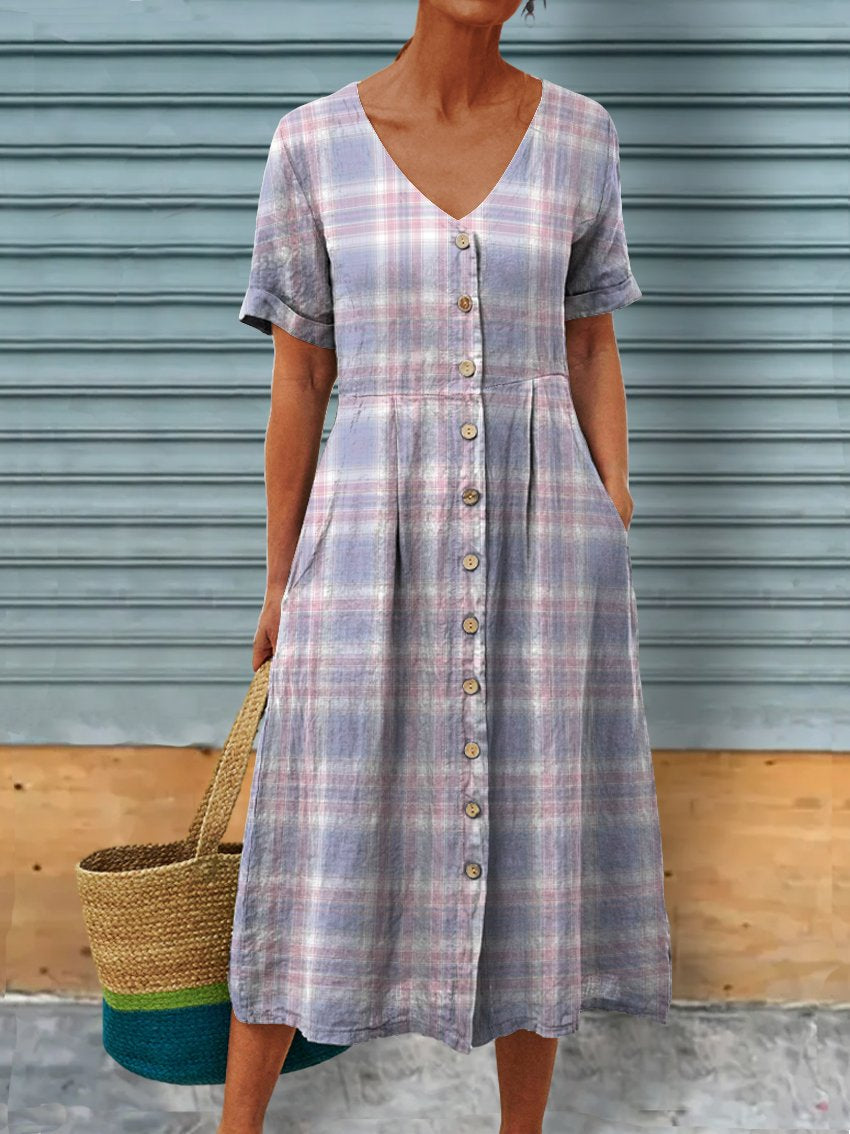 Women's Plaid Art Print Linen Pocket Tunic Dress