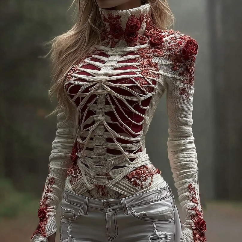 Women's Red Rose Skeleton Art Cozy Knit Turtleneck Sweater