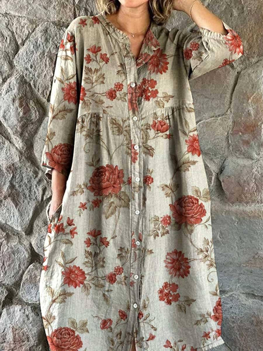 Women's Rose Floral Pattern Shirt Cotton And Linen Dress With Pockets