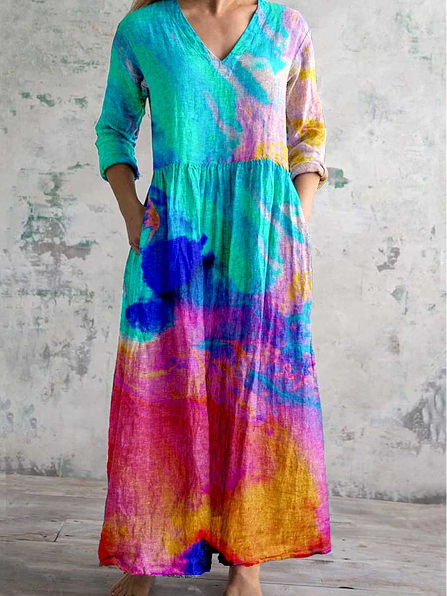 Women's Round Neck Rainbow Gradient Print Dress With Pockets