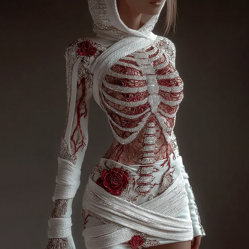 Women's Skeleton Roses Bandages Art Cozy Knit Hooded Mini Sweater Dress