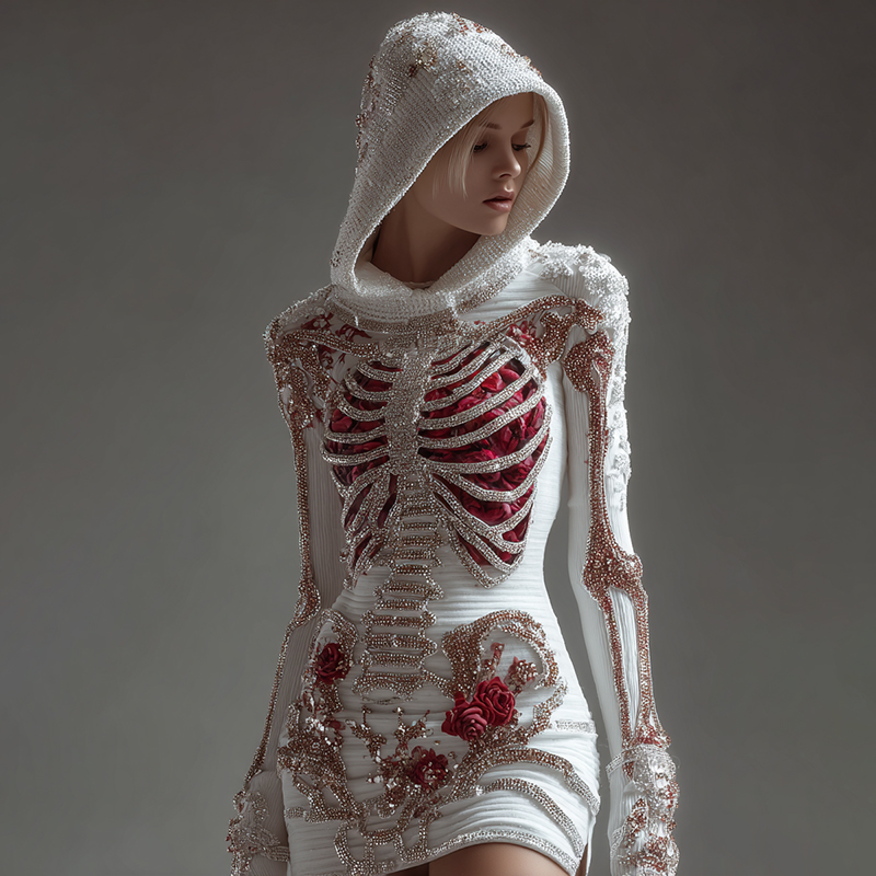 Women's Skeleton Roses Bandages Art Knit Hooded Mini Sweater Dress