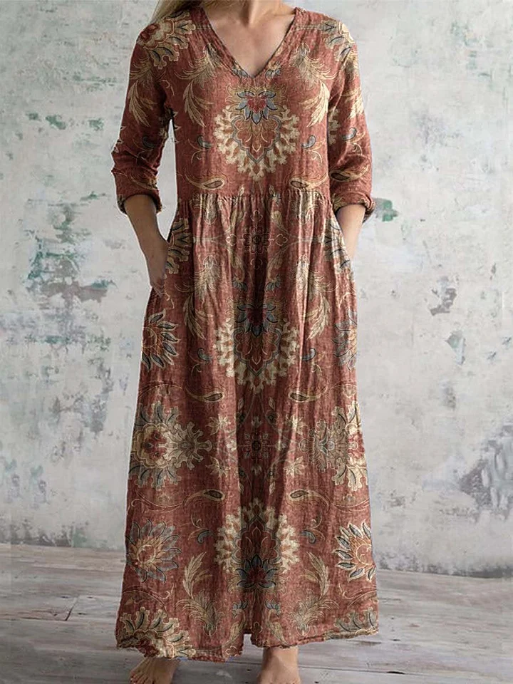 Women's V-neck Elegant Vintage Floral Pattern Cotton Shirt Dress