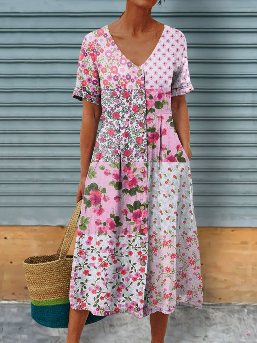 Women's Vintage Elegant Floral Art Pattern Print Casual Linen Pocket Tunic Dress