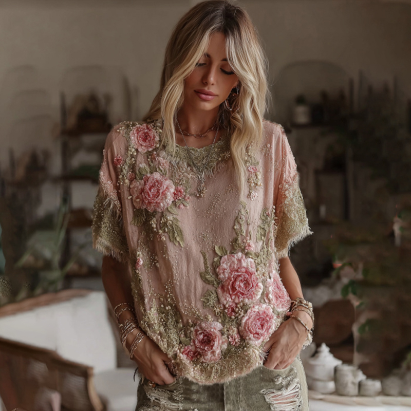 Women's Vintage Floral Art Linen Crew Neck Comfy T-shirt