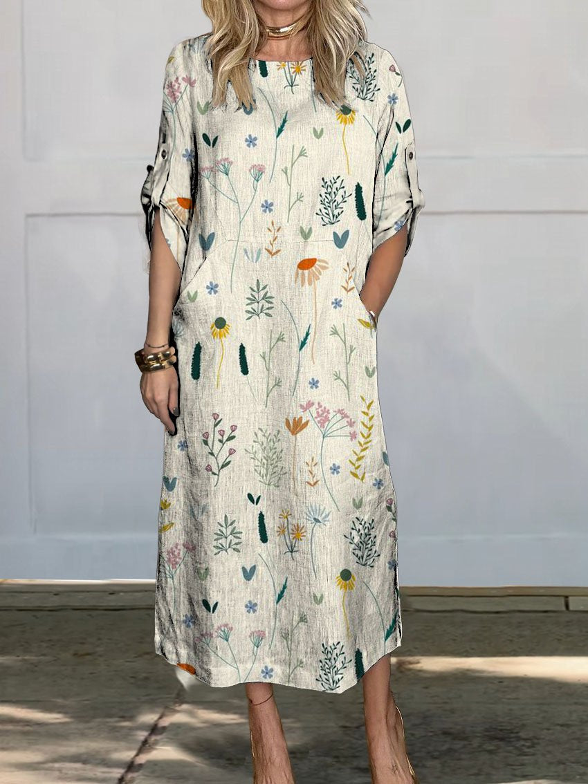 Women's Vintage Floral Art Printed Casual Comfortable Linen Pocket Dress