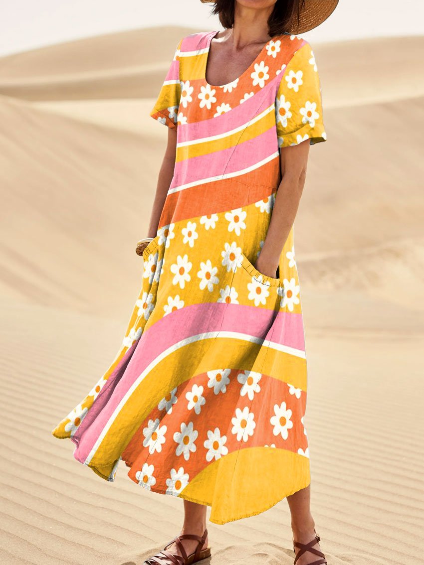 Women's Vintage Flowers Art Print Linen Pocket Dress