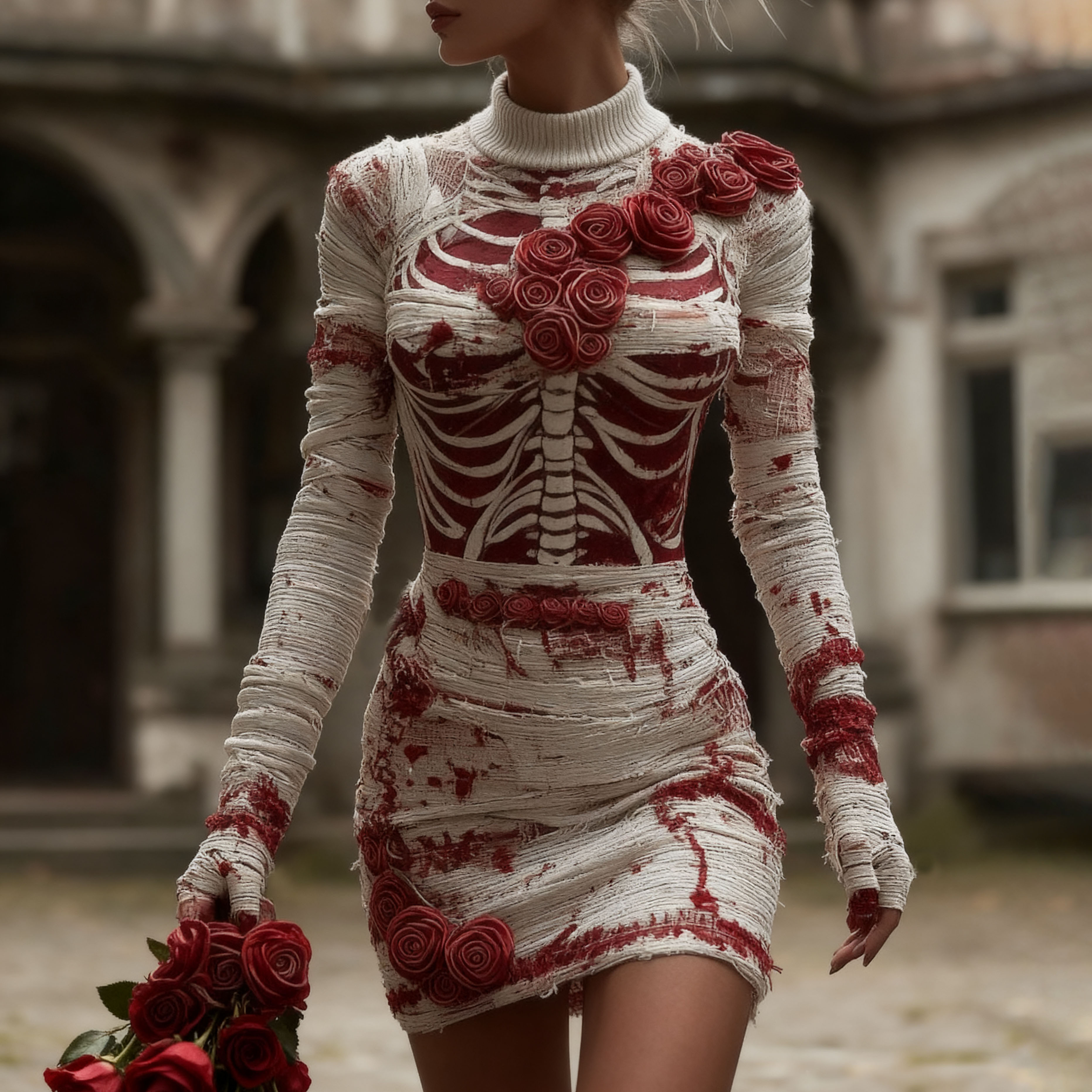 Women's Vintage Halloween Skeleton Red Rose Art Knit Mini Sweater Dress