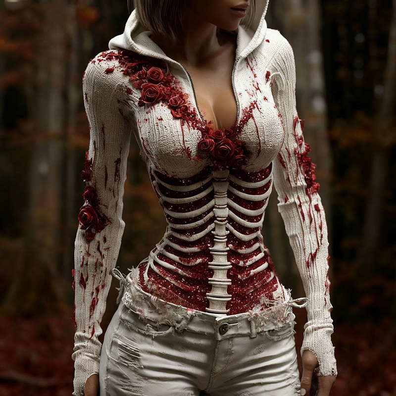 Women's Vintage Halloween Skeleton & Rose Art Zipper Hooded Sweater